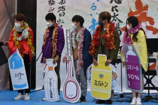 学長から一言:松永駅前の活性化を推進するプロジェクトMの皆さん、地元の社会福祉法人「虹の会」に協力して「虹まつり」の盛り上げに力を発揮したようですね。とくに感染症の予防や災害防止の啓発活動で活躍したとのことで、実に素晴らしい! これからも地域貢献のために頑張ってください。
