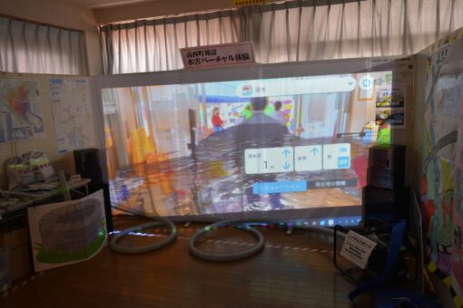 事前に、「新型コロナウイルス等感染症対策啓発活動チーム(コロナ禍で福祉施設が実践したコロナ感染対策を、寸劇形式で分かりやすく伝えるもの)」と、「水災害を想定した地域防災啓発活動チーム(身近な場所をバックに撮影した洪水のVR映像をスクリーンに流し、水災害の怖さを体験してもらうもの)の制作チーム」に分かれて、それぞれ準備に取り組みました。