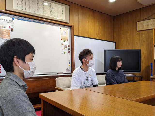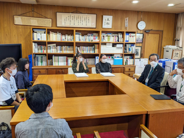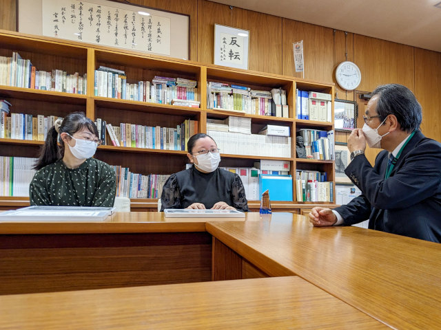 6月26日(月)に制作者が学長室を訪問して受賞の報告を行い、制作意図や制作過程などを説明しました。大塚学長からは、15年連続受賞についてのお褒めの言葉と今後の活躍に期待する激励をいただきました。
