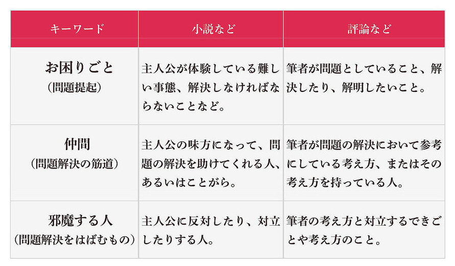 本システムのメインとなる、読む力を鍛えるためのコース「2 読書技能修得コース<本を読む>」では、「お困りごと(問題提起)」「仲間(問題解決の筋道)」「邪魔する人(問題解決をはばむもの)」という三つのキーワード(=質問)に則って本を読みすすめていきます。 これらのキーワードは、小説などの物語だけではなく、評論、エッセイ、学術研究書など、あらゆる本(資料)に当てはめることができます。