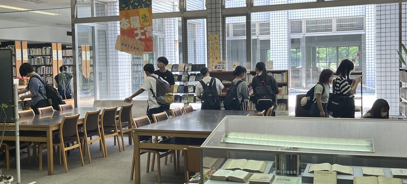 図書館の利用ガイダンスを受けて以来、久し振りに図書館へ来たという学生も、楽し気に選書しています。