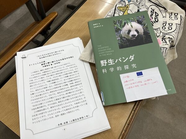 6月27日の授業内では、青木教授より昨年度のシステム参加学生の優秀作品を一部紹介しつつ、なぜその書評が優れているか、というポイント解説の後に、喜多村が実際に『野生パンダ科学的探究』(魏輔文著、科学出版社東京、2022年)という本を読んでシステムに参加してみた「模擬回答の説明」と「ポイント解説」を行いました。