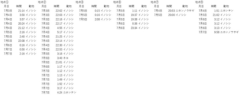 その後、7月3日(月)~7月7日(金)まで、カメラを仕掛け続けたところ、47個の動画の撮影に成功しました。カメラを仕掛けた場所は下の図の通りです。その間、一晩だけ雨の日がありましたが(6日)、やはり、その日は動物の撮影回数が少なかったです。雨の日は行動が少なくなるようです。