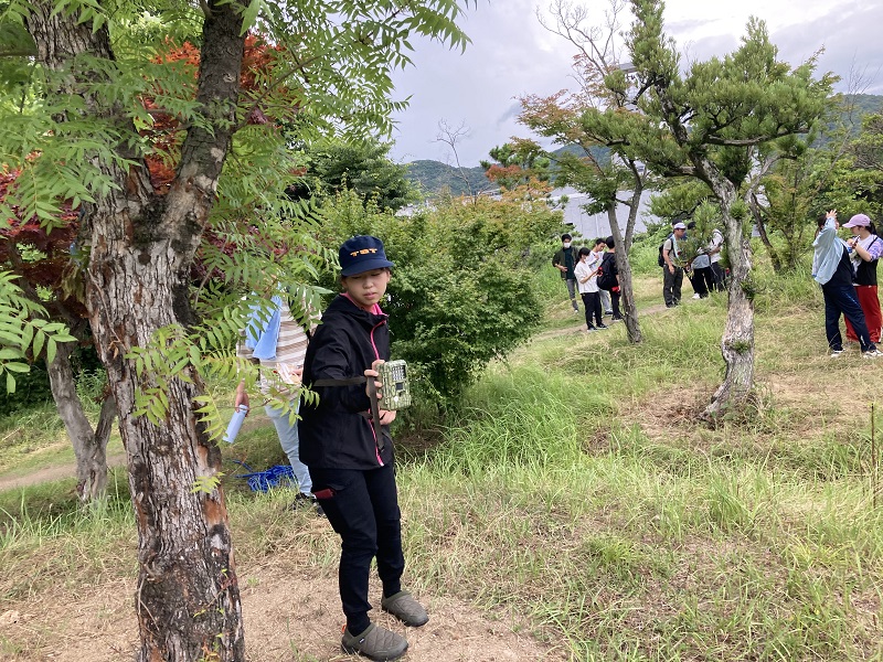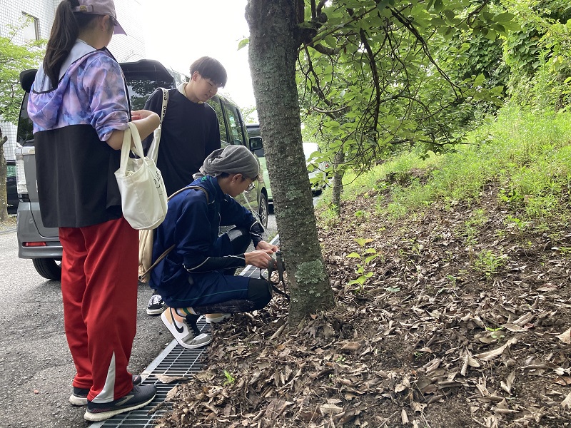 観察と言っても直接観察できるのは、昼間に動く動物だけです。私たちは夜行性である哺乳類の生態を知るために、温度を感知して動画や静止画を撮影することのできる自動撮影カメラ(トレイルカメラ)を使いました。よく農家さんが獣害対策として使うカメラです。実は昼間に動く私たちは哺乳類の中では珍しく、多くの哺乳類は夜行性なのです。6月30日(木)~7月1日(金)にかけて、学内の10地点にカメラを設置しました。結果は、残念ながら天気に恵まれず、一晩では哺乳類を撮影することができませんでした。しかし!