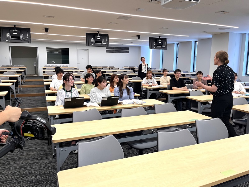 次に、9時40分から、未来創造館の2階大講義室に移り、5年生と大学院生の協力により、授業の様子を撮影しました。大学教育センターのSuzuki Heather Anne(スズキ ヘザー アン)助教とDriussi Cordelia(ドリュッシー コーデリア)助教による英語の授業の様子です。薬学部の学生たちは、主に1~2年次に開講される共通教育科目「英語Ⅰ~Ⅳ」の授業を受講しています。また、毎年、数名の薬学生は、カリフォルニア大学リバーサイド校カリフォルニア州立大学サンマルコス校などの海外協定校の語学研修(➡留学体験記)にも参加しています。