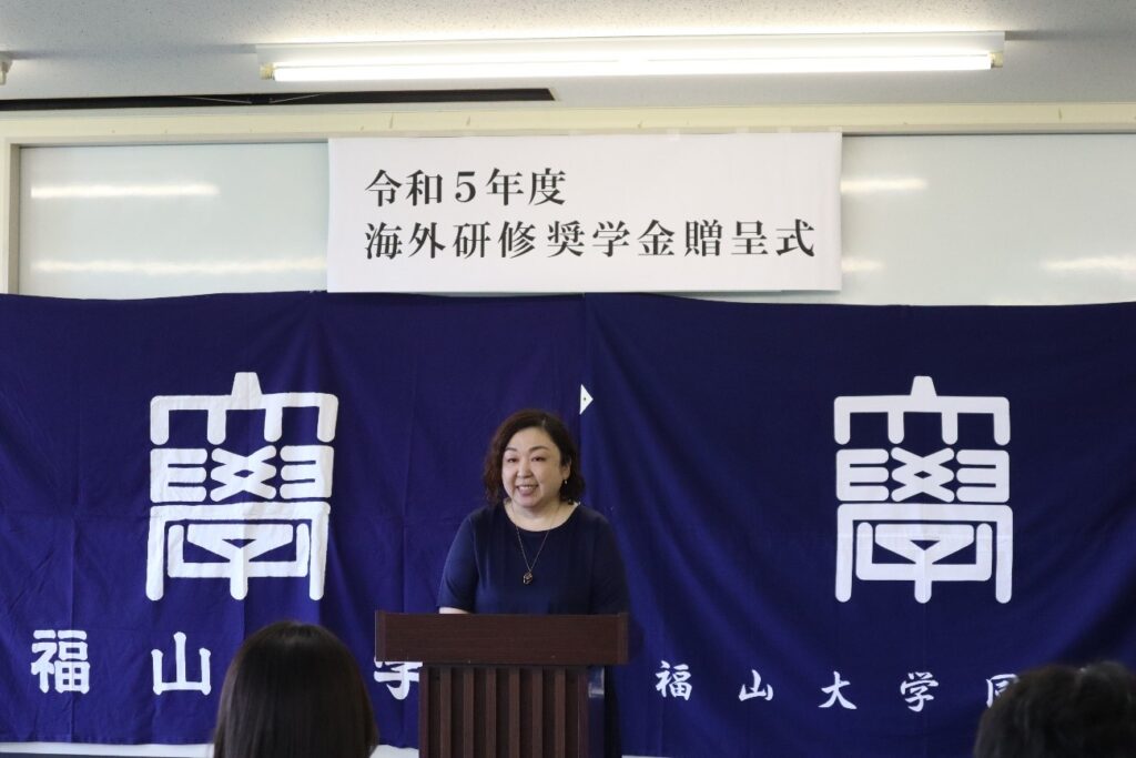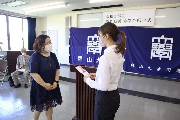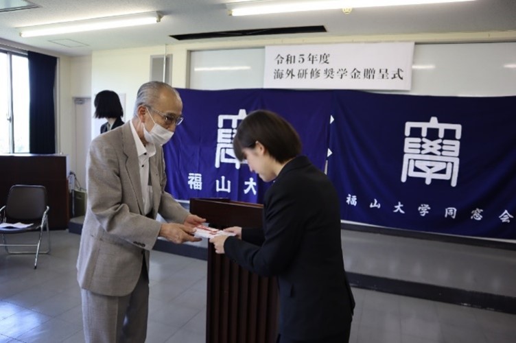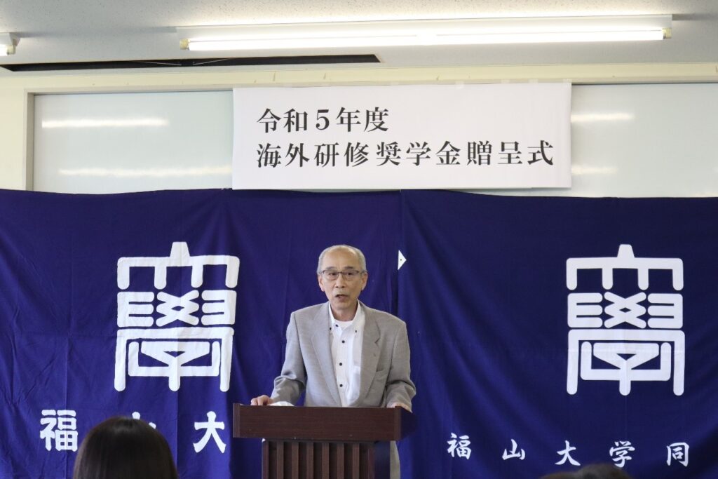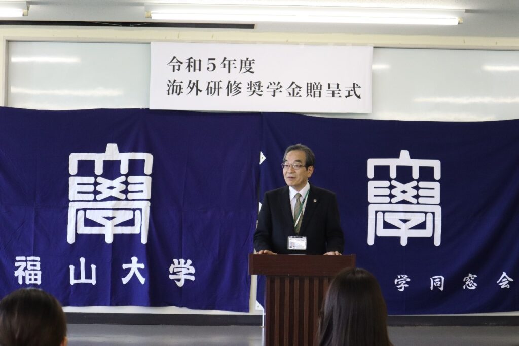 まず、 豊田経済学部同窓会長より「同窓会の目的は、会員相互の親睦を図り、母校との連絡を緊密にするともに、福山大学及び福山大学経済学部の発展に寄与することであり、在学生の課外研究活動の支援事業も含まれます。同窓会で在学生に何か支援できないか検討した結果、大学とも協議し、海外研修へ参加される学生への支援をさせていただくことになりました。海外研修では、日本ではできない経験を学んでほしいですし、グローバルな視点を磨いてほしいと考えています。身体に気を付けて頑張ってきてください。」と贈呈の挨拶がありました。