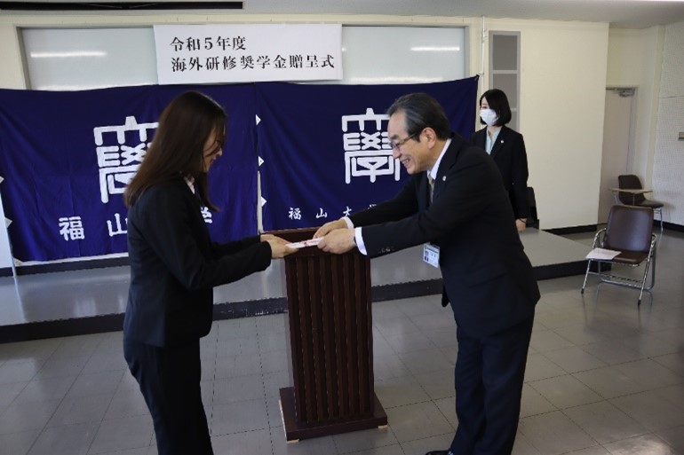 学長から一言:コロナ禍が下火になり、経済学部が実施する短期研修をようやく本格的に再開できるようになりました。しかし、折からの円安や航空運賃の高騰は研修参加者にとって痛手となります。そこで、その対策として、経済学部同窓会、福山大学後援会、そして学校法人福山大学からの寛大な支援により奨学金を授与できました。研修参加者の皆さん、大いに頑張って来てください。