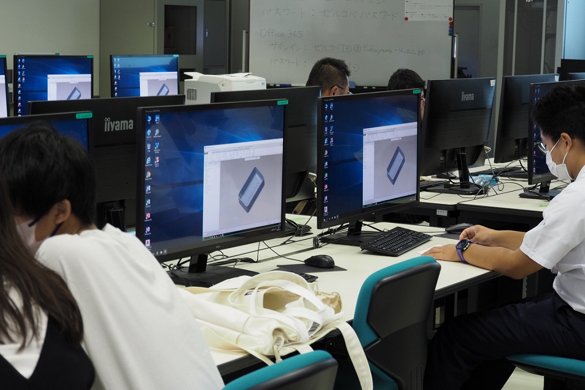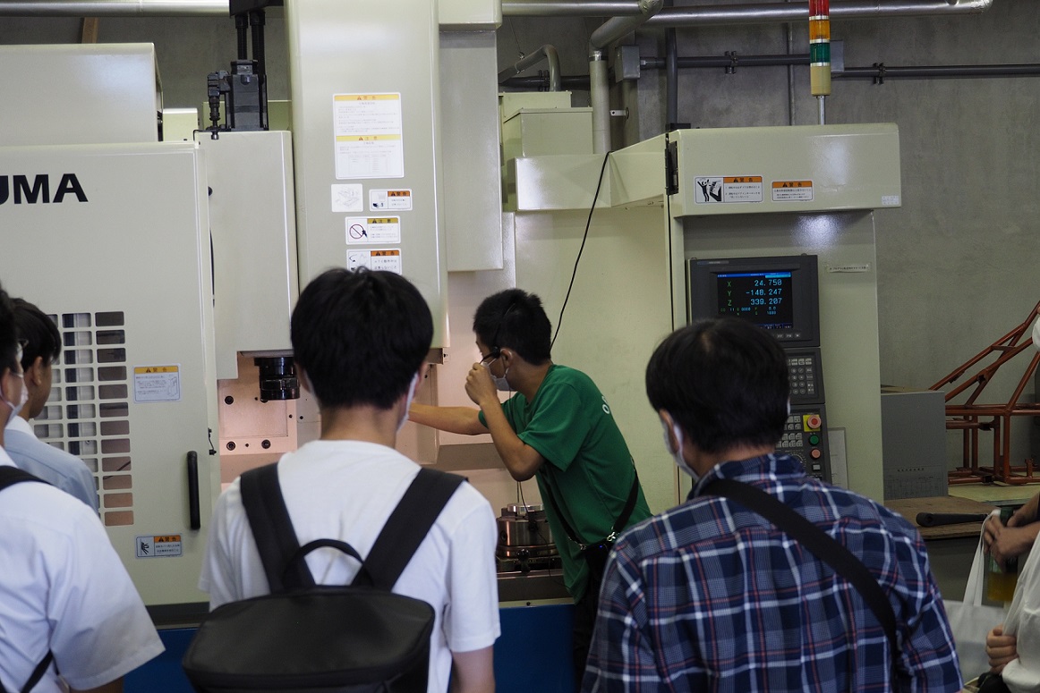 バーチャルのモノづくりのあとは、リアルなモノづくりを見学です。高性能な3Dプリンタの一種である高速光造形機とコンピュータ支援加工システム(CAM)の見学と実際に加工している様子の見学です。