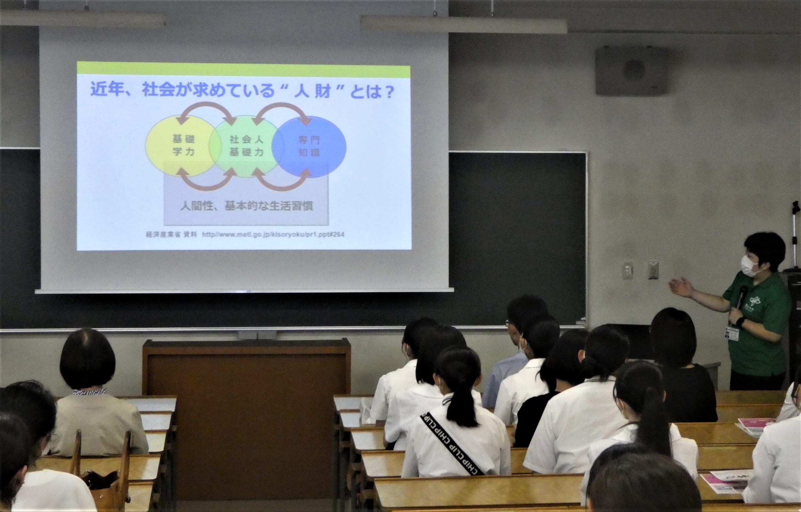 管理栄養士の人材が、社会で求められていることも、山田直子講師から紹介させていただきました(下の写真)。沢山の高校生の皆さん、保証人の方々が熱心に耳を傾けて下さいました。ありがとうございました!