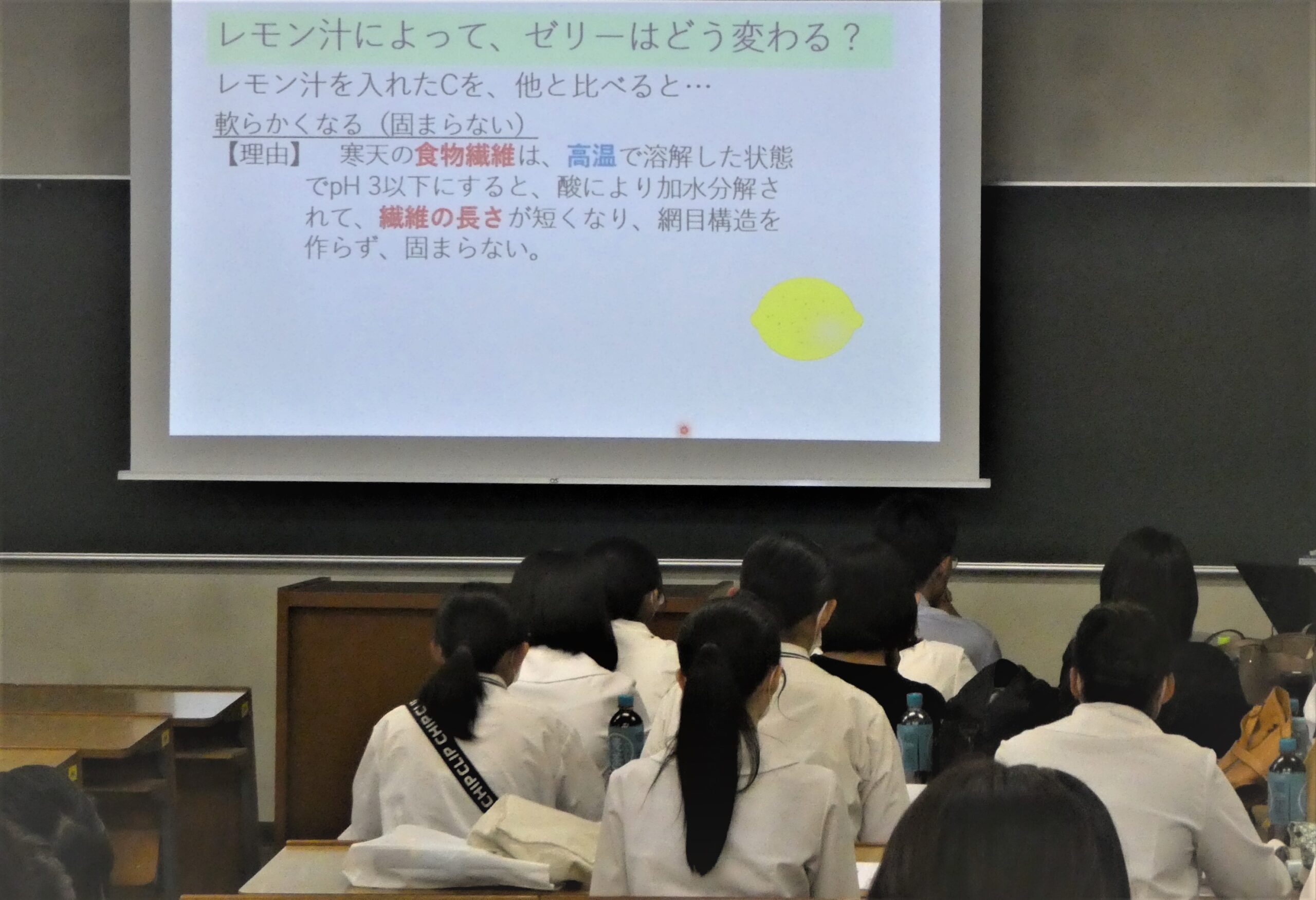 皆さんは、ゼリーは食べたことがありますよね?! 市販されているゼリーは、食品会社がそれぞれ会社の特徴も出して沢山の種類が出回っています。また、凝固剤は食品の粘りを出すために様々な食品(ヨーグルト、お菓子、料理など)に使用されています。今回の実験は、その基礎知識に関する内容でした。さらに、実験の後の講義では、凝固のメカニズムなど食品学の一端を勉強しました。食品学の講義は、井ノ内直良教授が担当しました。
