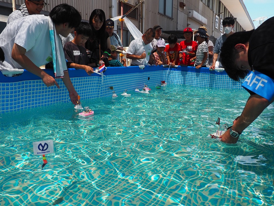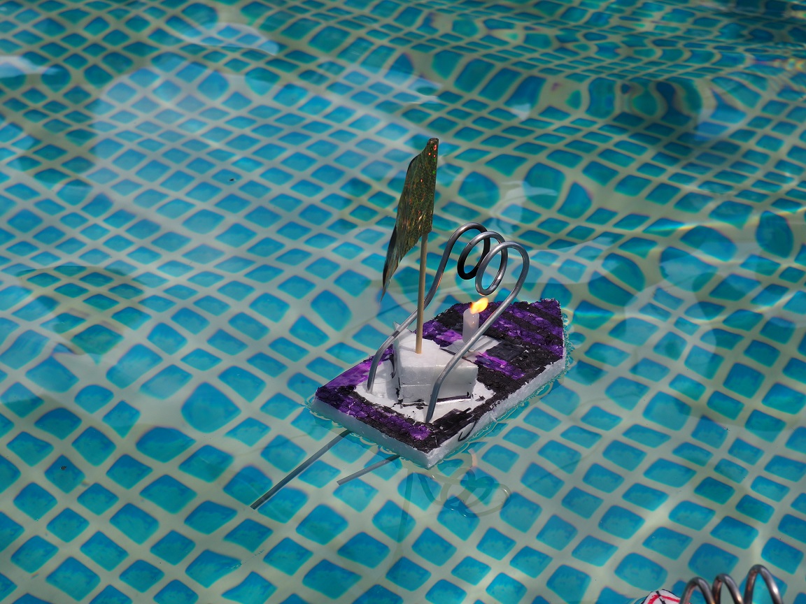 午後からは、さっき作った船を特設プールで走らせました。ちゃんと走るかとても心配でしたが、すべての船が無事ちゃんと走りました。夏の良い思い出になれば幸いです。