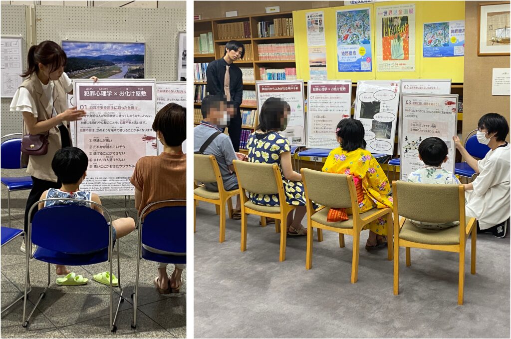 <お化け屋敷の体験だけではなく、草戸千軒の歴史や犯罪心理学についても説明します。2年生の藤原さん、1年生の岡村さん、3年生の板谷さんです。>