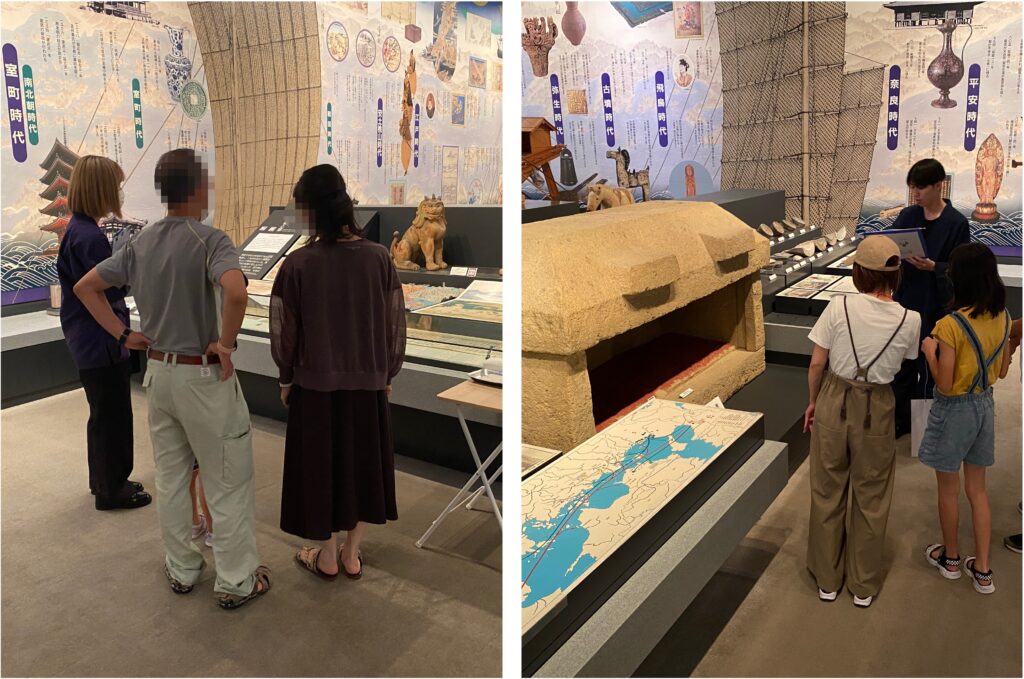 写真からも伝わるように、学生たちは1年生から4年生まで学年の垣根なく、抜群のチームワークを見せています。加えて、県立歴史博物館の宮野館長をはじめ、学芸員の石橋さん、杉山さんの心強いサポートもあり、初日と2日目を順調に迎え、無事に終えることができました。