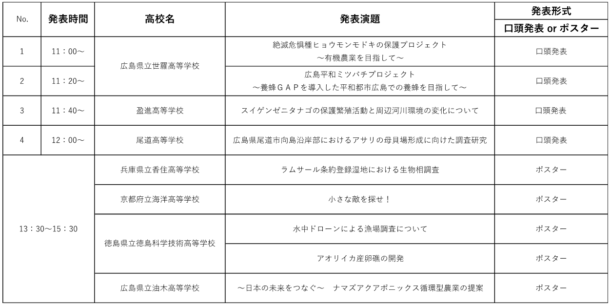 その結果、広島県のみならず兵庫県、徳島県、京都府の7つの高校から口頭発表4題、ポスター発表5題、合計9題の申し込みがありました。