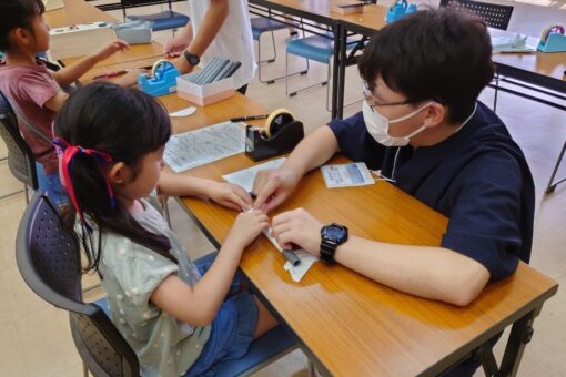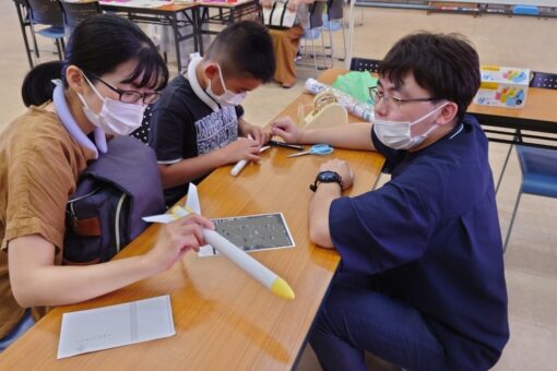 イベントは、10時から17時まで実施され、小中学生と保護者合わせて約120名の参加がありました。ペーパーロケットは簡単な構造ですがまっすぐ安定した姿勢で飛翔させるには丁寧に製作する必要があります。指導した学生は参加してくれた子どもたちの学年に合わせて丁寧に指導していました。