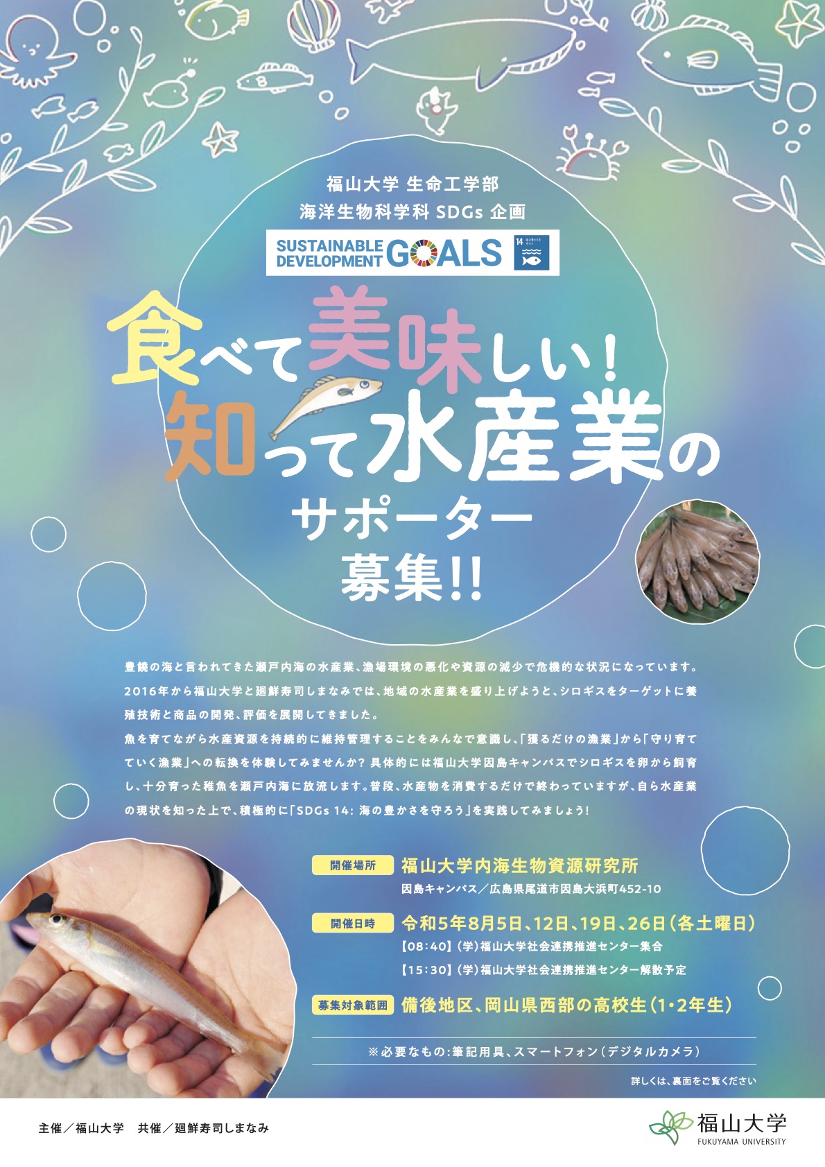 この舞台の主役は、福山大学で養殖の技術開発と実証化に取り組んでいる「シロギス」です。なお、この催しはシロギス養殖やその商品化で連携いただいている廻鮮寿司しまなみ((株)アペックスインターナショナル)さんとの共催で実施しました。
