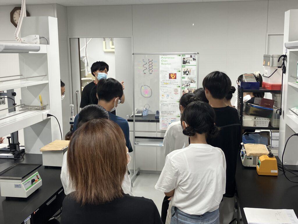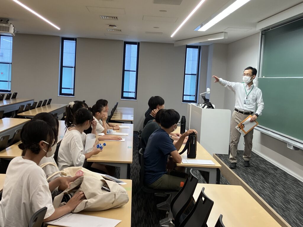 概要説明後は、2グループにわかれ、井上薬学部長をはじめ薬学部教員や学生の皆さんの案内で、薬学部の教育・研究エリア、 全学共用エリア、 11階にある眺望がよいCROSSING CAFÉを見学しました。教育・研究エリアでは、勉学や実験に励んでいる大学生の姿を間近で見たり、講義室や研究室内へ入って普段大学生が学んでいる雰囲気や研究内容に直接触れていただきました。大学が「90分」授業であることを聞いた際には、皆さん「えぇ!すごく長い!」と、中学校と大学の違いにとても驚いた様子でした。また、施設内見学では、実験・研究設備や専門的な蔵書、全学利用可能なラウンジなど、全ての物に皆さん興味津々の様子でした。大学の充実した設備や専門的な学び、日頃どのように大学生たちが学んでいるのかを肌で感じることができたと思います。数年後大学生になった自分の姿をより現実的にイメージしていただくことができたのではないでしょうか。