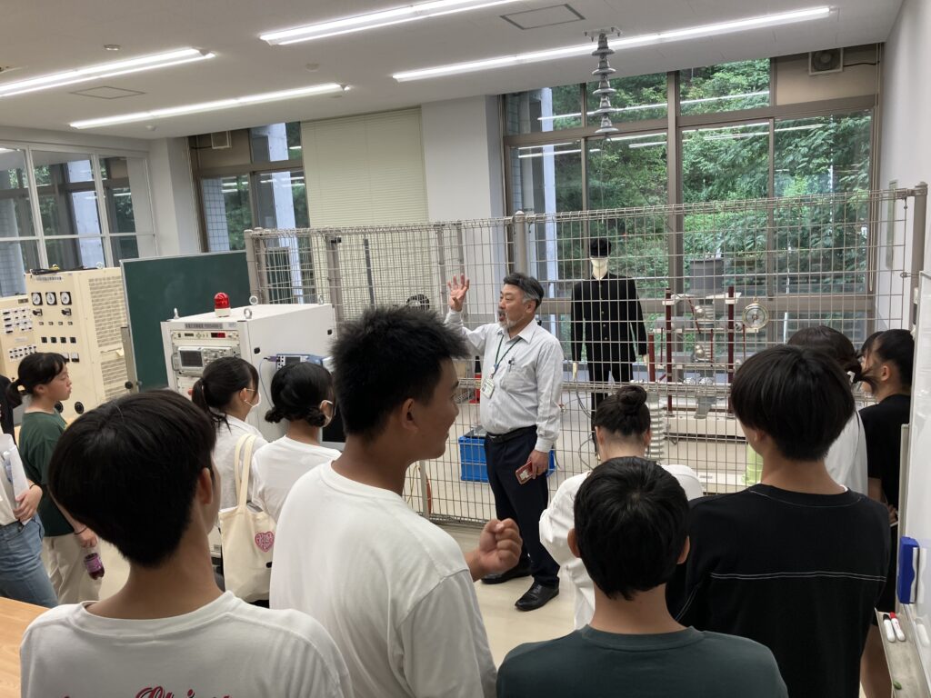 次に工学部棟(2・3・4号館)では、香川工学部長補佐から学部・学科の説明を受け、学生が作成した卒業制作の模型や、ロボットや機械などに直接触れたり、体験していただきました。安心して暮らせる豊かな社会を実現するための「ものづくり」をテーマとしている工学部には、大学生の自由な発想を活かし作成した作品等が数多くあります。その中の1つに遠隔分析コックピットがあります。塾生お一人にその中に入ってもらい、小型ロボットを実際に遠隔操縦していただきました。開閉音なども凝った作りとなっており、小型ロボットが動く度に皆さんから「おぉー!」と感嘆の声が上がっていました。その他にも、高電圧実験装置による高電圧の放電実験も見学していただき、「バチンッ」という大きな音と青白い光に驚いていました。