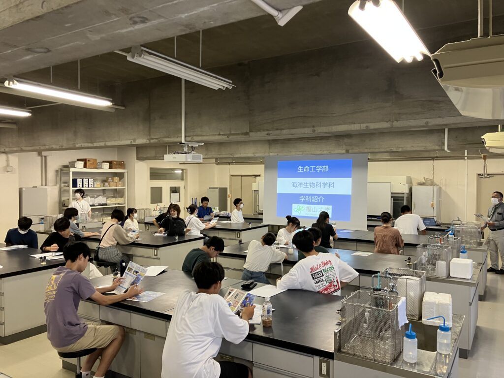 最後に、 生命工学部海洋生物科学科棟(16号館)では、北口海洋生物科学科長より学科説明をしていただき、その後、施設内にある水槽展示エリア等の見学を行いました。