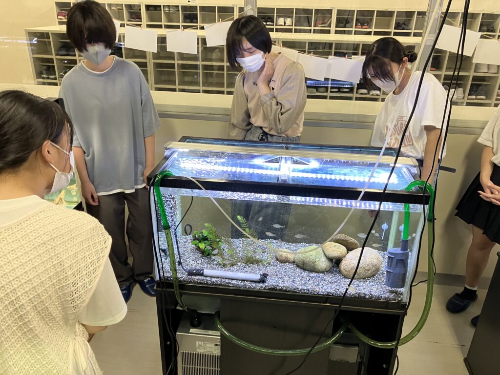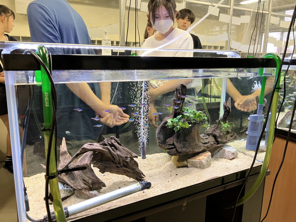 熱帯魚など様々な魚が飼育されている水槽展示エリアに入った瞬間、皆さんわくわくした様子で、「わぁ、綺麗」、「キラキラしてる」と、1つ1つの水槽を熱心に覗いておられました。また、質問の時間には、「マリンバイオセンター水族館はいつ開館しているんですか?」などの質問があり、「行ってみたい!」との声も多く聞かれました。塾生の皆さんに大変興味をもっていただけた様子で、付き添った私も非常に嬉しく感じました。今回はご案内できませんでしたが、因島キャンパス(内海生物資源研究所)にあるマリンバイオセンター水族館にも、ぜひ、足を運んでいただければと思います♪