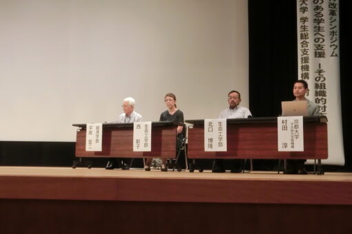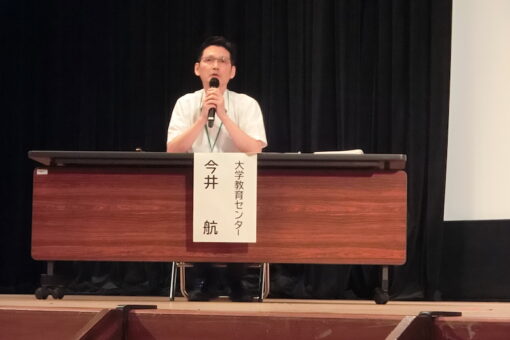 直後のパネルディスカッションでは、大学教育センター副センター長の今井航教授を進行役として、皮切りに経済学科の平田宏二教授から、次いで生命栄養科学科の西彰子准教授、海洋生物科学科の北口博隆教授から、そうした学生への各支援の事例が紹介され、それを通じて抱えることにもなった様々な問題点の指摘がありました。