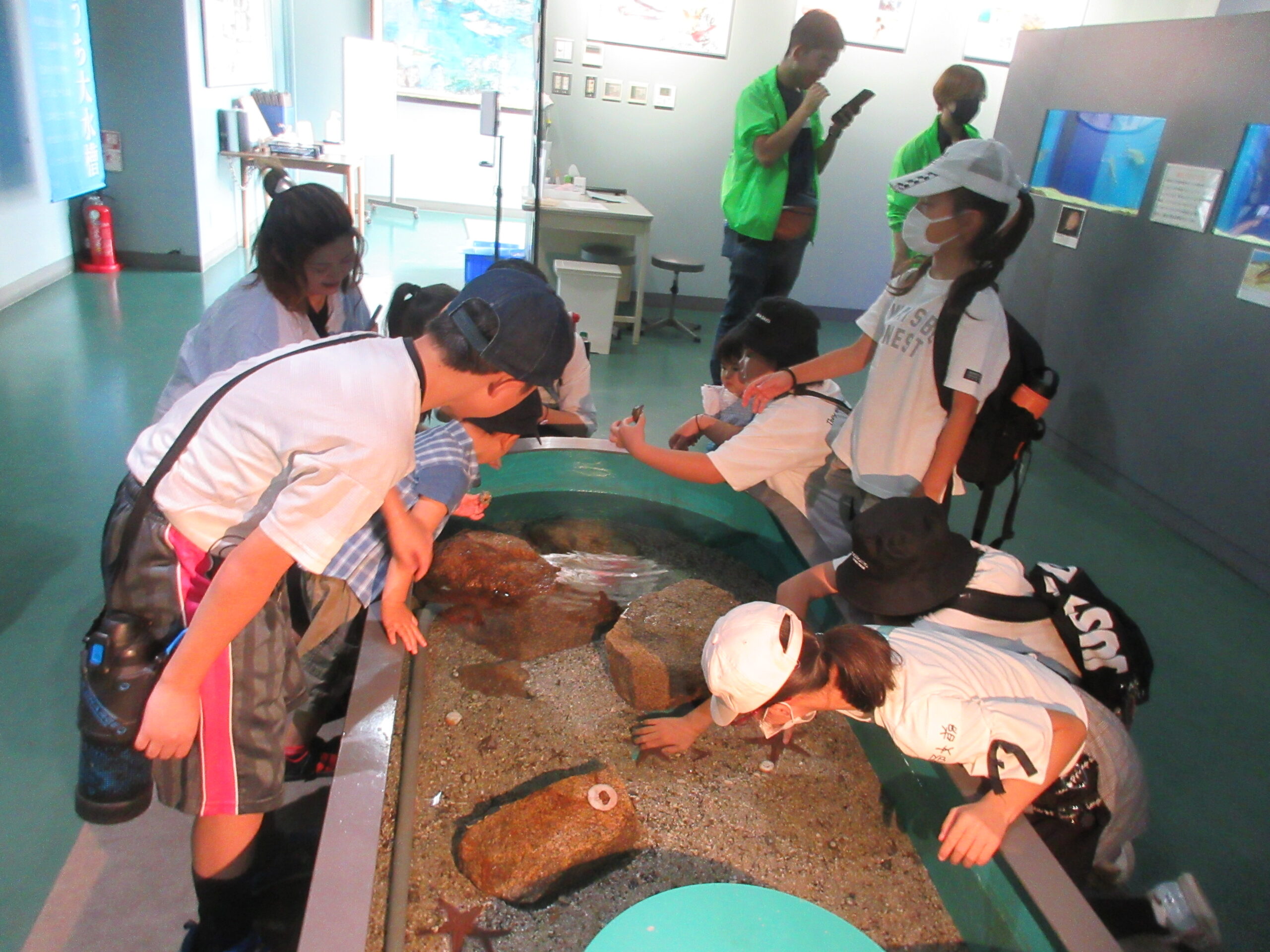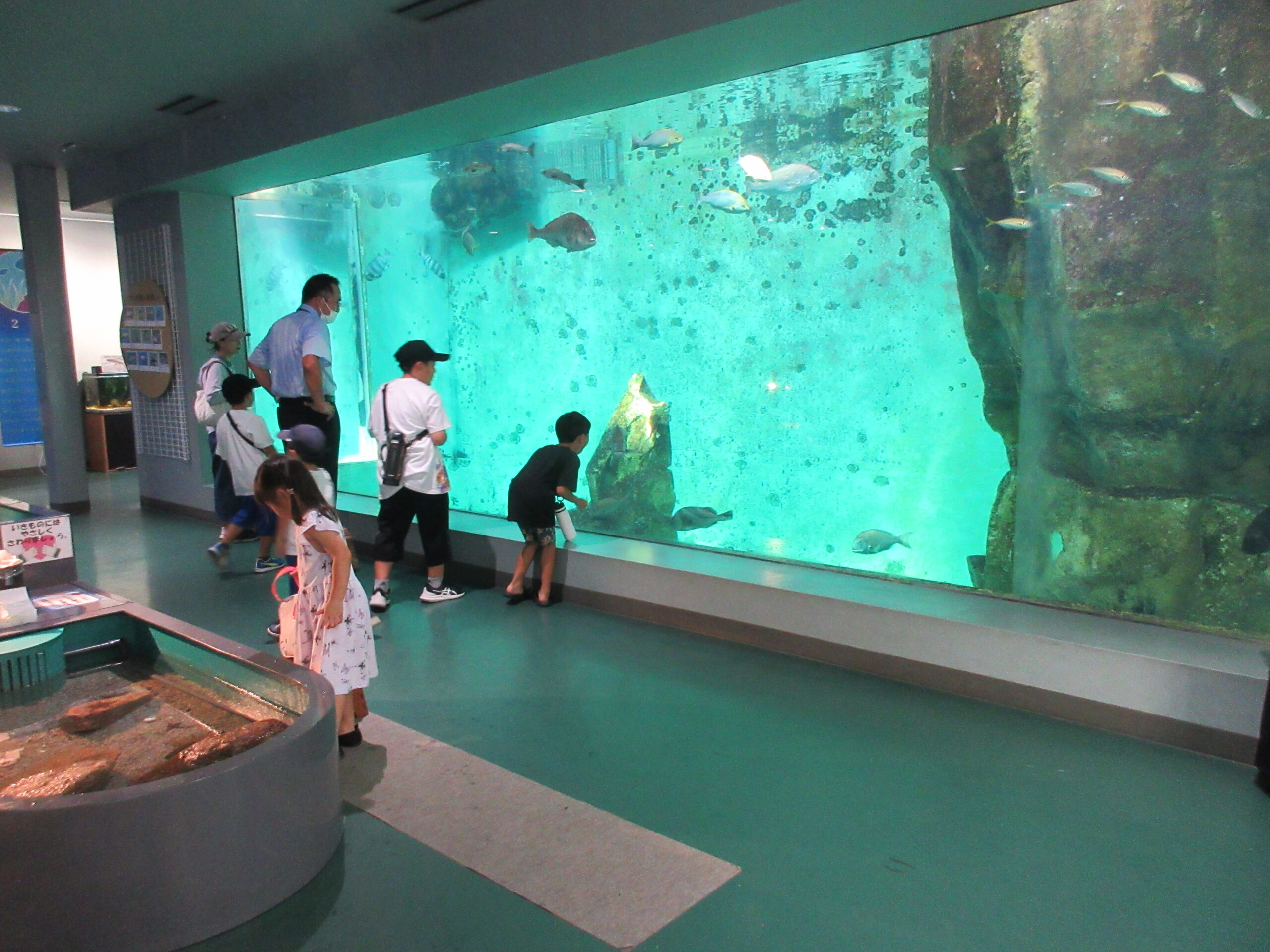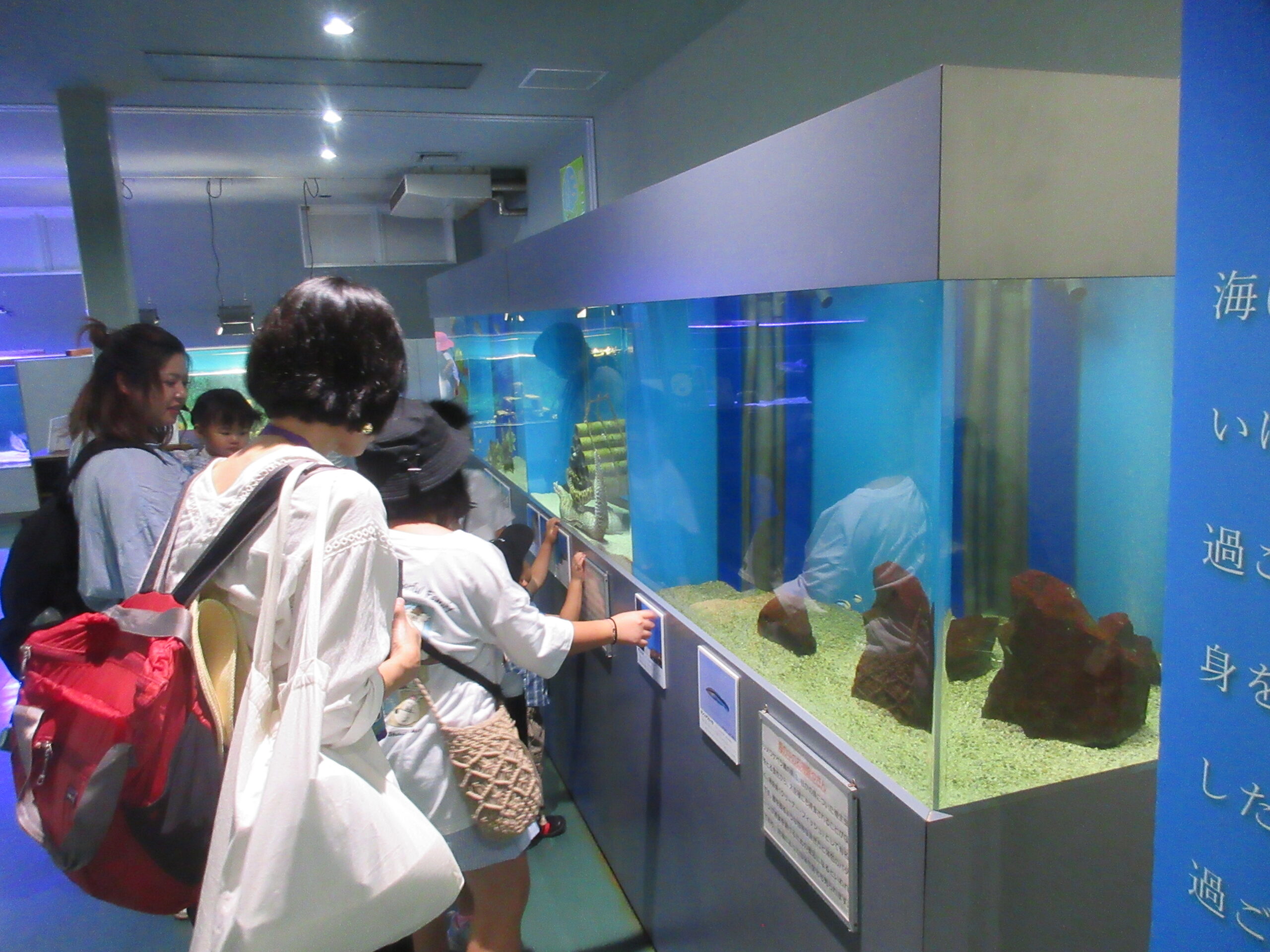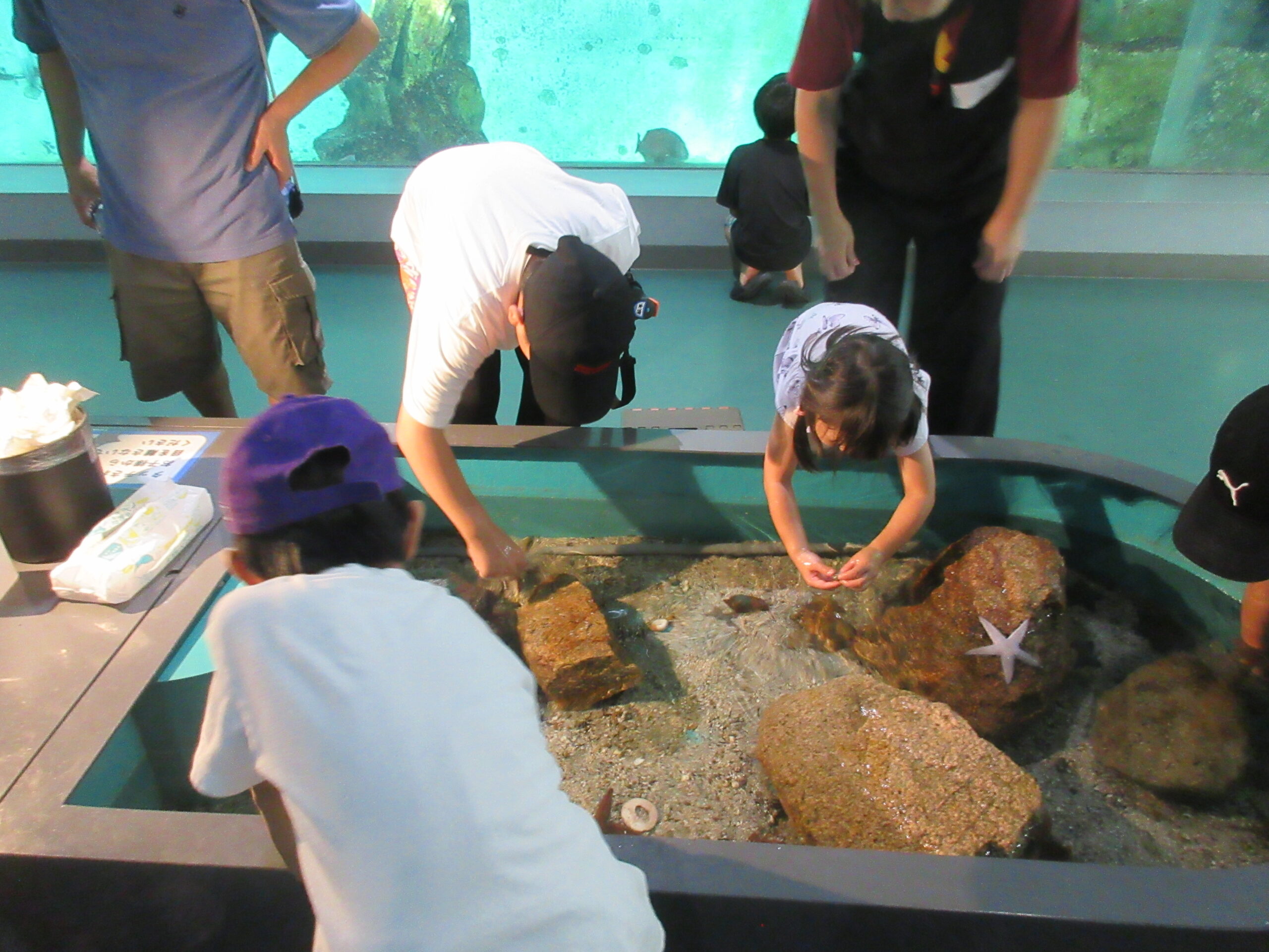 続いて水族館の見学です。子ども達のお目当てはむしろこちらだったのかもしれません。まずは入ってすぐのところにある、タッチングプールです。多くの子ども達が大水槽よりもこちらを取り囲みます。「ヒトデだ!」とか「ヤドカリもいるで」とか「ナマコがかわいい!!」などと、身体を乗り出して触っていました。