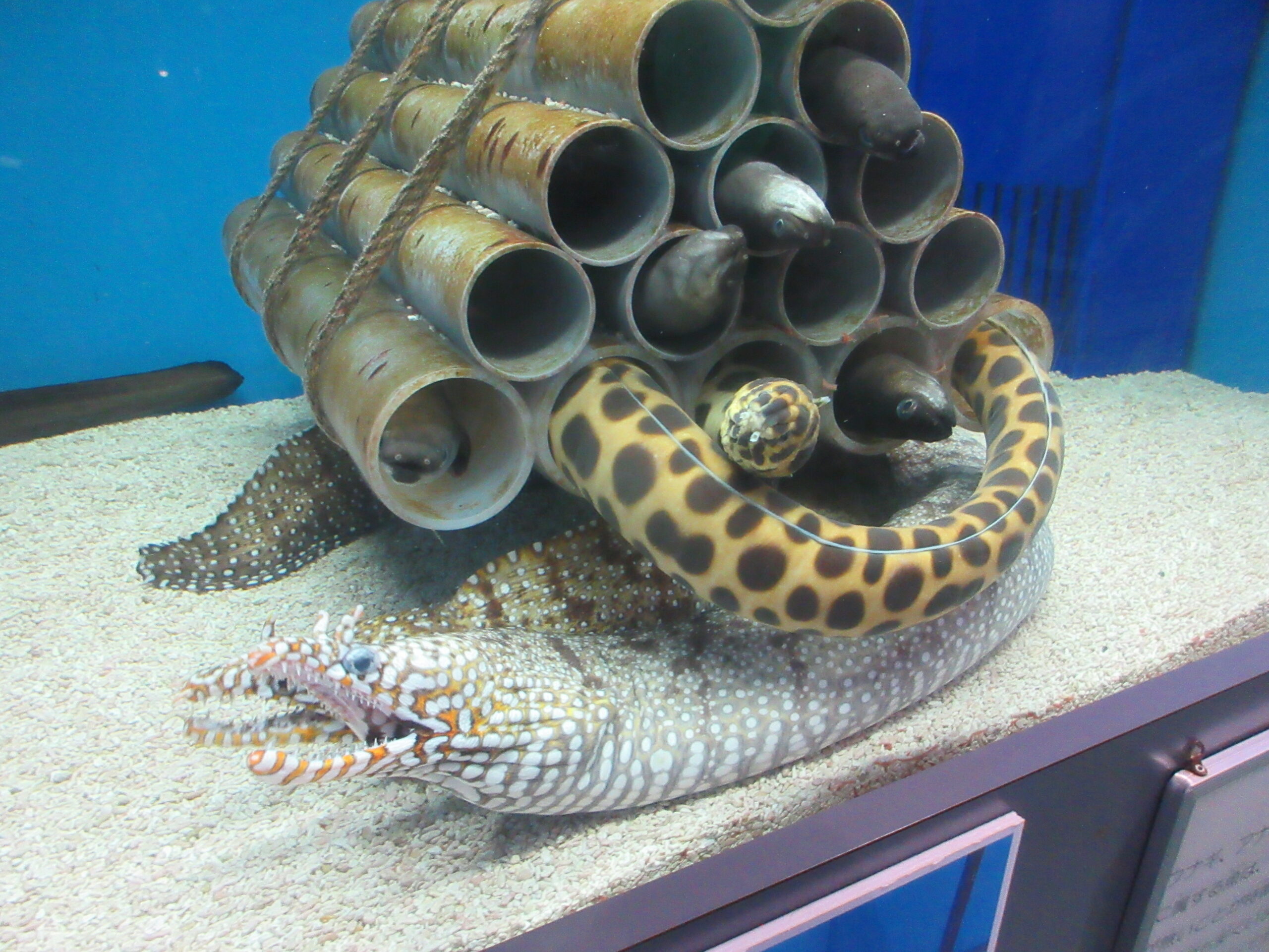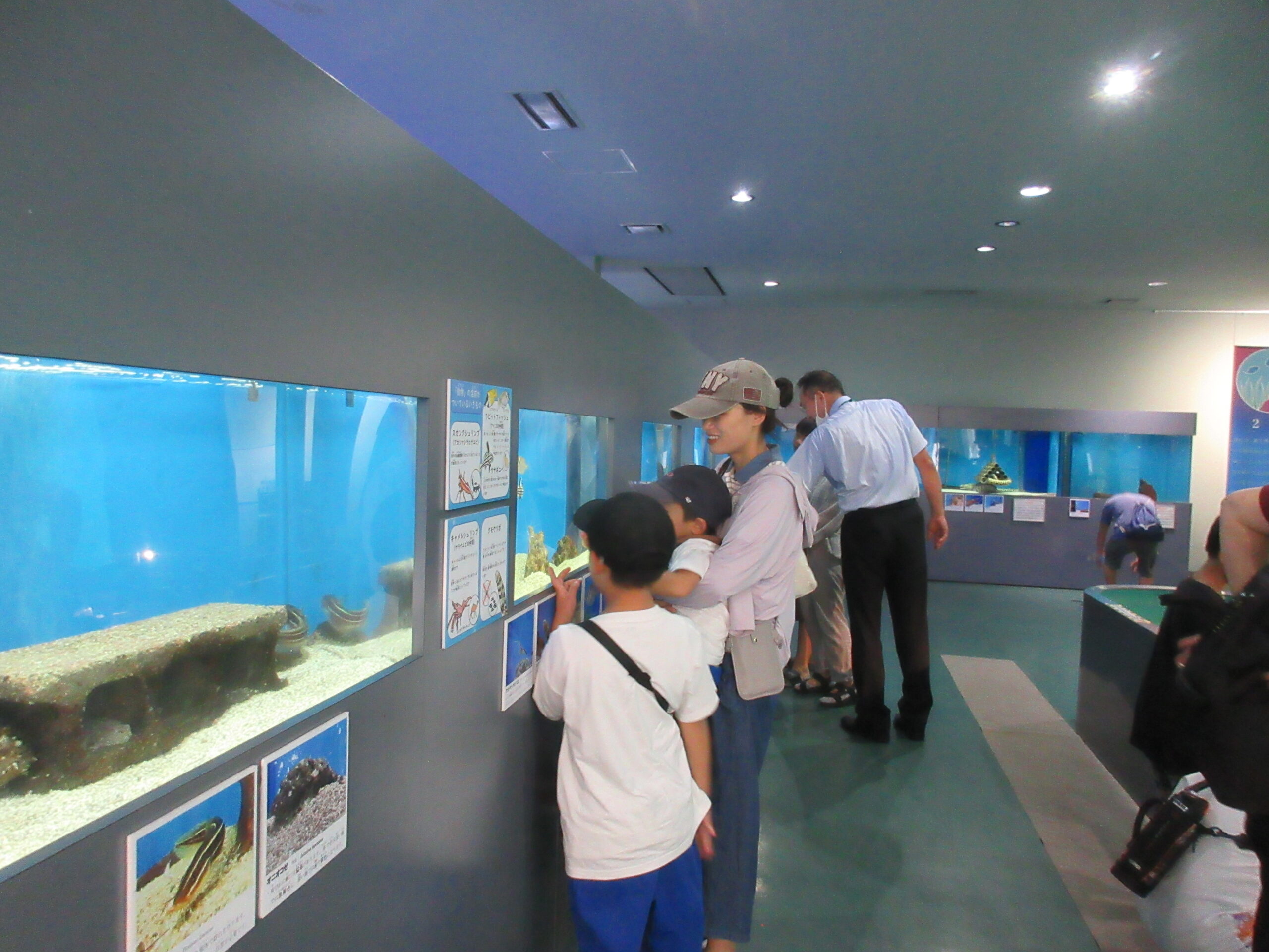 もちろん、大型水槽や数々の小型水槽の中を泳ぐ魚たちにも興味津々で、「これは何て魚?」とか「あっ ウツボだ」とか言いながら、ガラスに顔をくっつけるようにして見入っていました。保護者の方たちも「あれかわいいね」とか「きもち悪~」などと、子どもと楽しくお話しされていました。水族館では少し時間をとって、ゆっくり見ていただきました。
