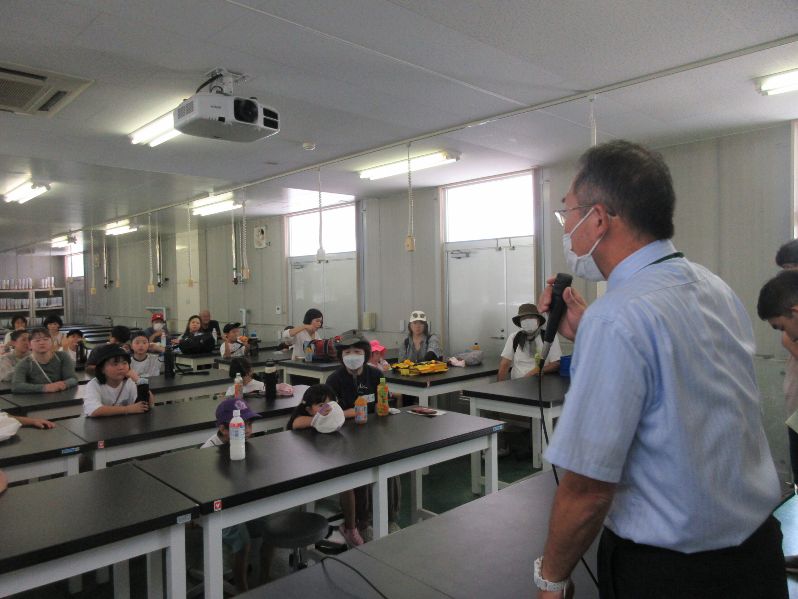 キャンパスに着くと、まずバスに積んでいた冷えた飲み物を配り、太田教授から今日の全体の説明を受けました。そして全体を2つのグループに分け、第1グループはキャンパス内の見学、第2グループはすぐに近くの桟橋で待機している第二爽風丸に向かいました。