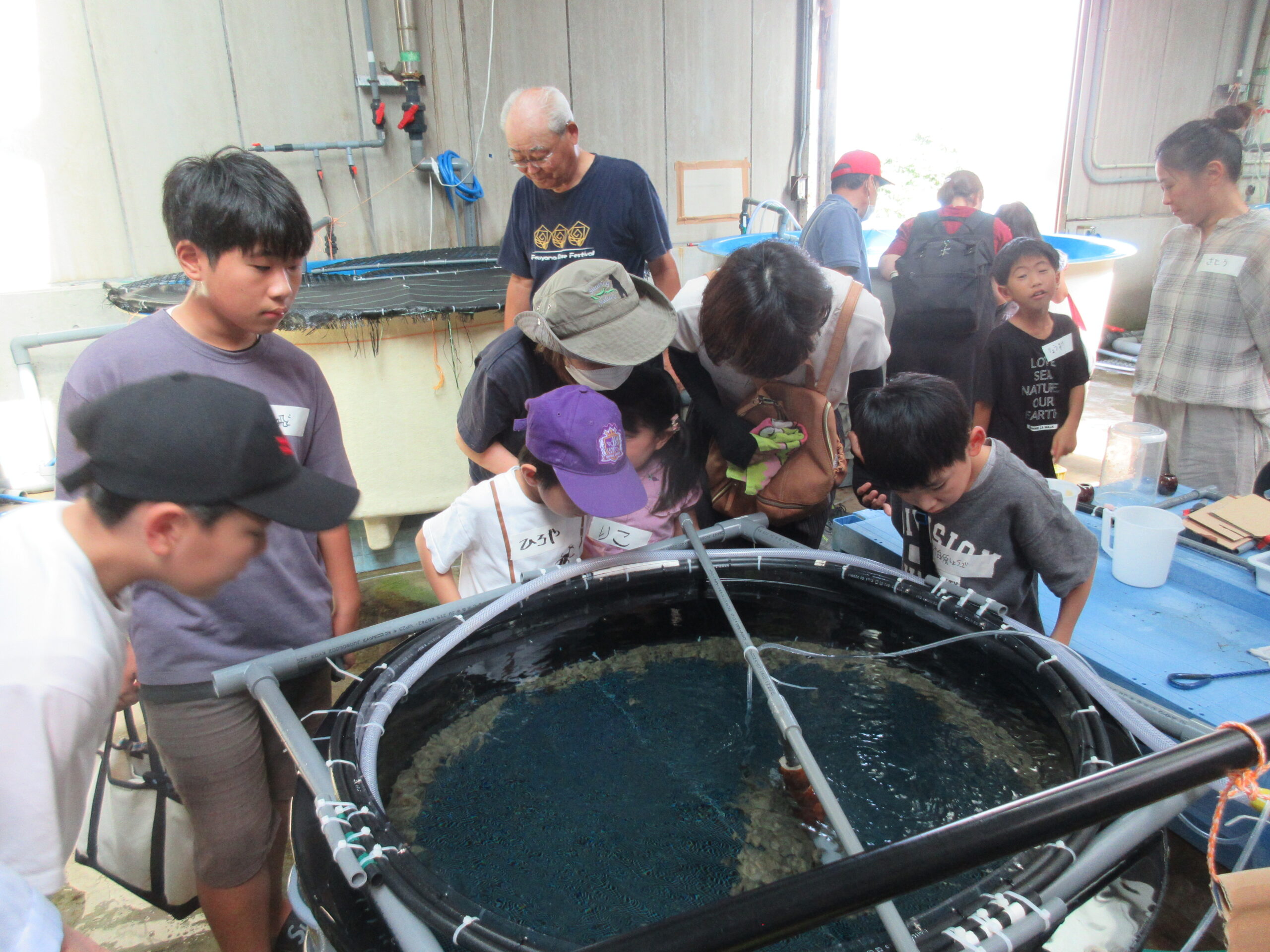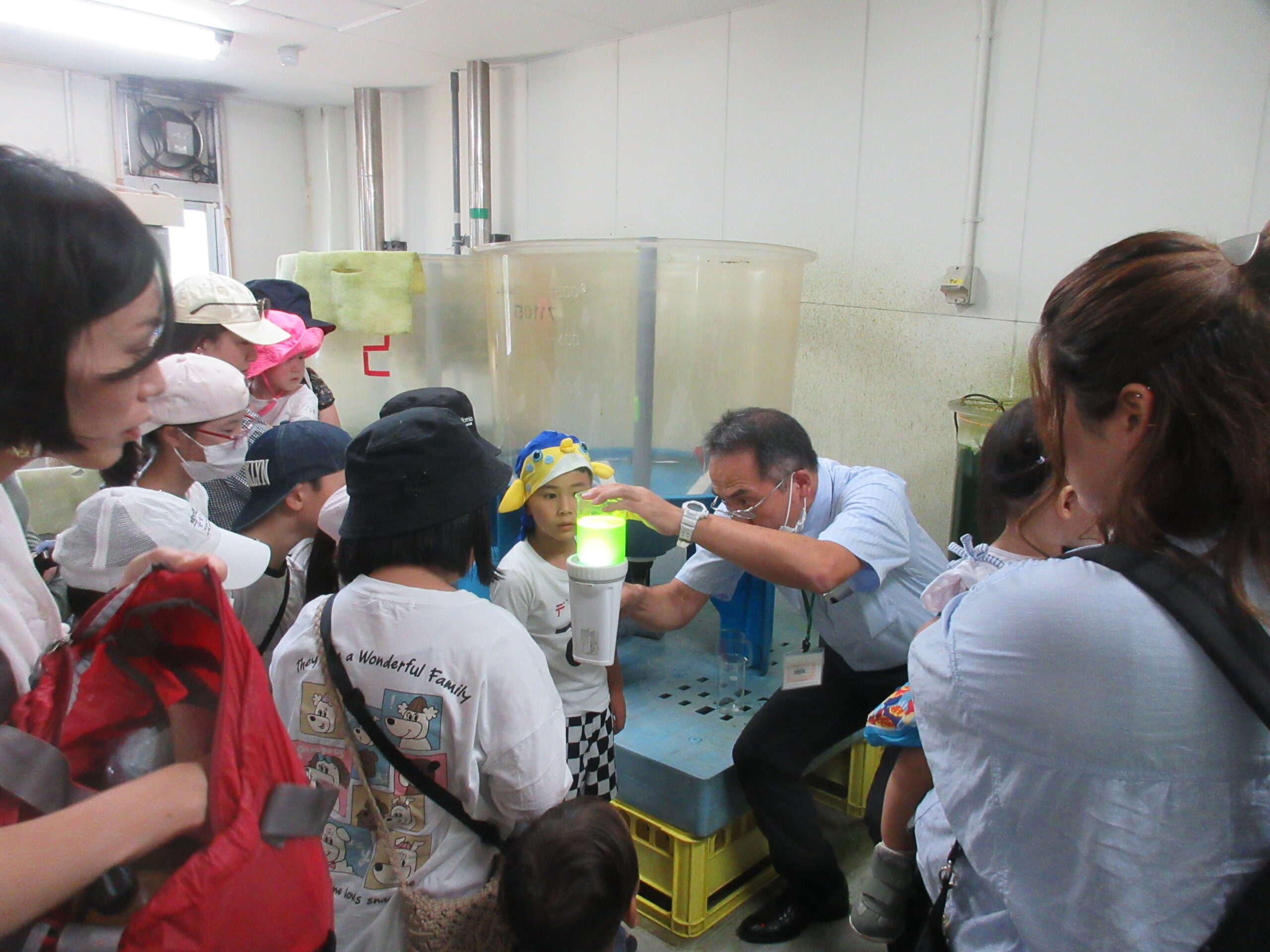 いよいよ見学開始です。まず生まれたばかりの魚の赤ちゃんが2日くらいで目が見えるようになり餌が食べられるようになった時、どんな餌をもらっているかの説明です。それはシオミズワムシというすごく小さな動物プランクトンで、因島の研究所ではこれを培養して増やしています。そして他の栄養素と混ぜて、生まれたての魚の赤ちゃんに食べさせているのだそうです。太田教授はビーカーの底から懐中電灯を当てて、ちいちゃなワムシでも目に見えるようにして、観察させてくださいました。子ども達はちょっと緊張気味でしたが「見えた!」と小さな歓声を上げていました。