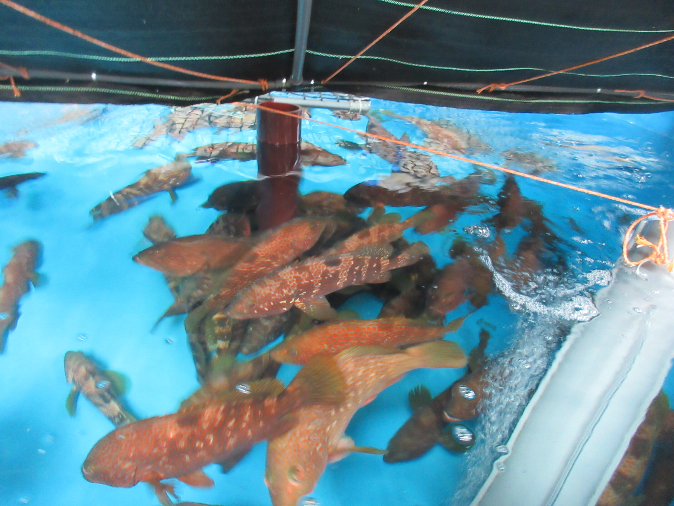 そのまた隣のタンクでは、結構大きくなったキジハタが元気よく泳いでいました。このキジハタもマークを付けて放流されるそうです。キジハタ君、立派になってまた会おう!!