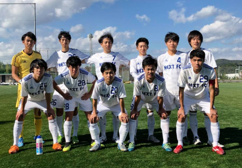 NEXT.FCとは、もともとは本学サッカー部OBチームとして活動していた社会人サッカーチームです。今年度よりOBだけでなく経済学科の学生を選手として加え、新たなチームとして再スタートを切りました。
