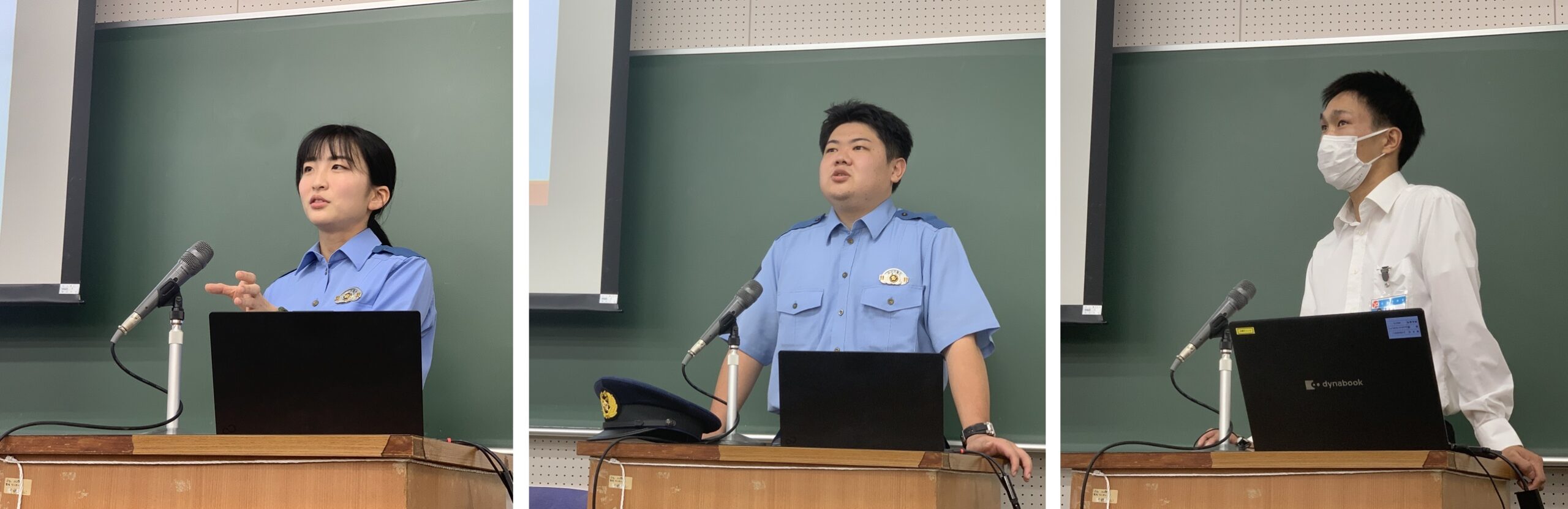 今年度は、私(大杉)が本学に着任し捜査心理学研究室(大杉ゼミ)を開設した2019年に1期生として在籍していた斎藤翔太さんを中心に、同じく同級生で犯罪心理学研究室(平ゼミ)に在籍していた増原直枝さんと工藤孝明さんも加わった、現役若手警察官3名による特別講義が実現しました。