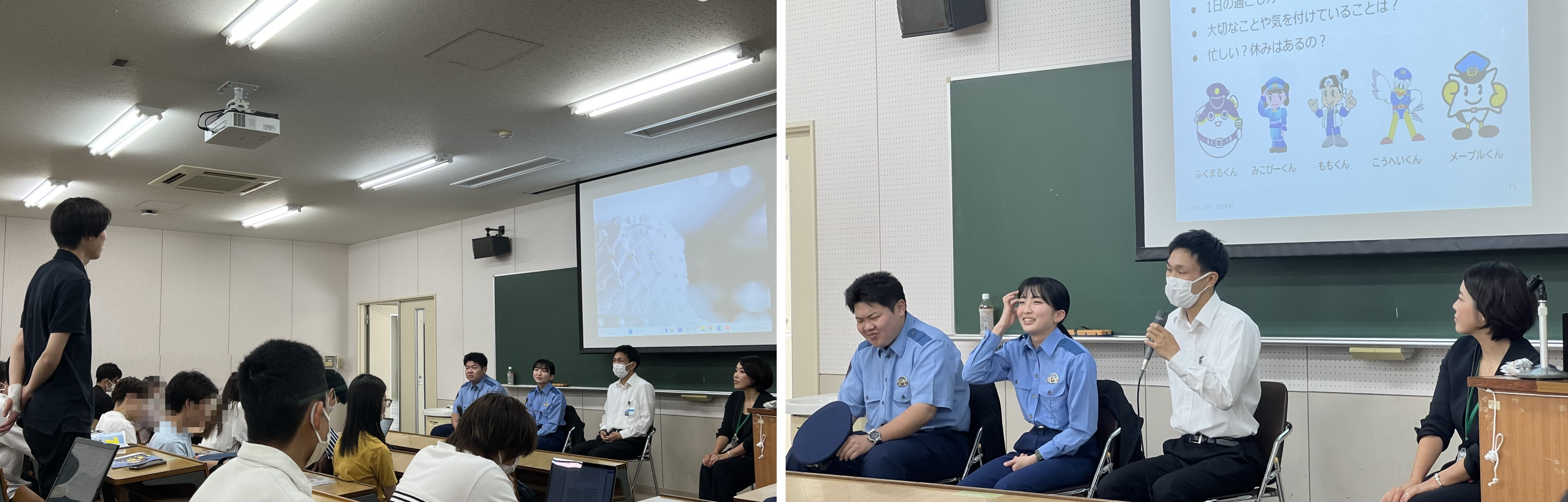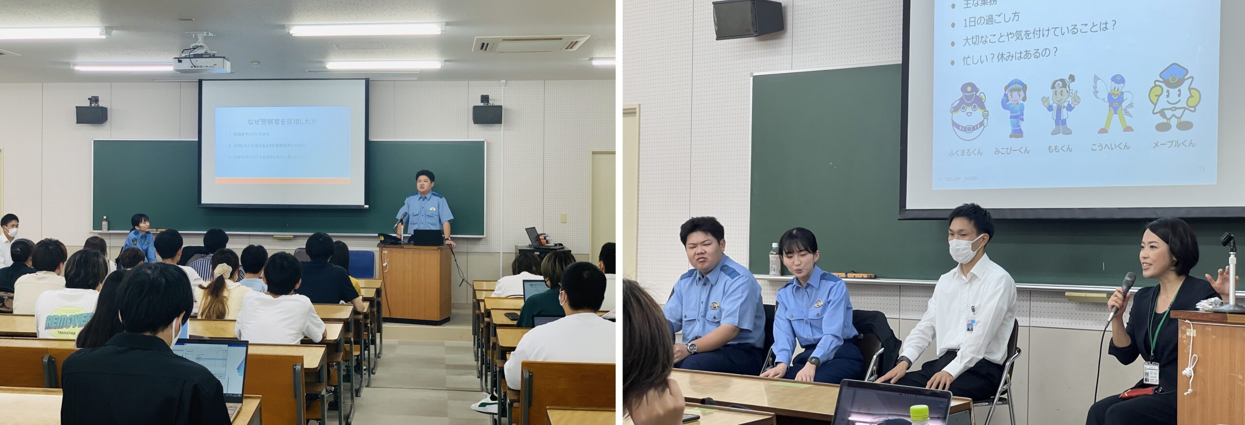 今年度も、2回の特別講義が開催されました。1回目は現役警察官である卒業生3名による特別講義、2回目は福山西警察署の刑事課長による特別講義でした。