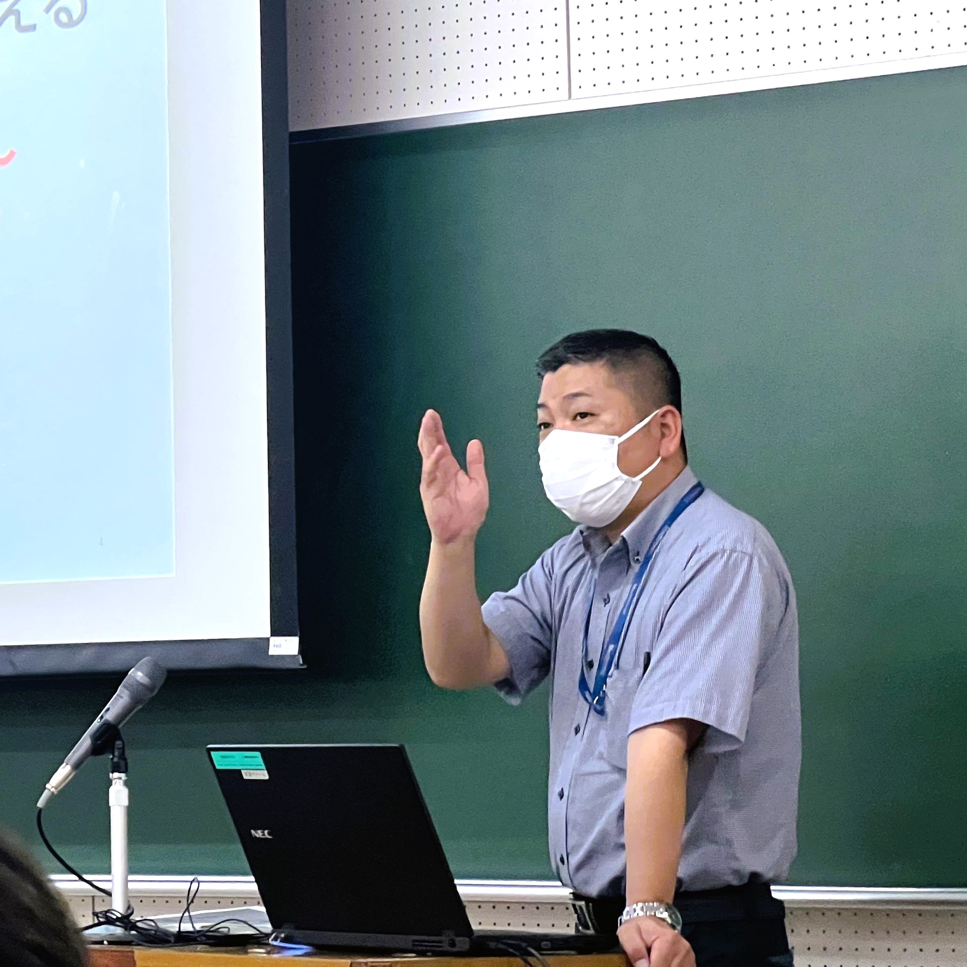 島根県警察で勤める斎藤翔太さんは、警察学校や現場仕事で出会った様々な経験や困難を、ユーモアを交えて伝えてくれました。学生の頃から変わらぬ人柄が存分に伝わるスライドも披露してくれ、「警察官のお堅いイメージが変わった。」という受講生が多かったようです。また、「大学で学んだことも経験したことも、どんなことも無駄にならない。」という力強い言葉は、多くの受講生の胸に響いていました。