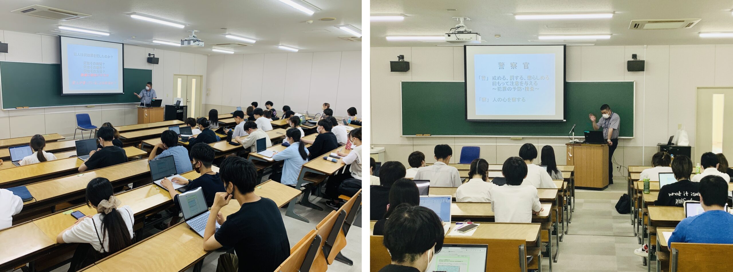 受講生の中には、将来警察関係の職に就きたいと考えている学生も多くいます。現場の生の声が聴けるとあって、多くの質問がありました。その一つ一つに、時に悩みつつ、時に笑いを交えつつ、真摯に応えてくれた特別講師の皆さんでした。