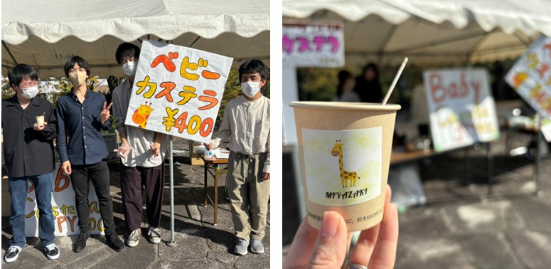 認知心理学研究室は、ベビーカステラを販売していました。チョコとプレーンのミックス1本での勝負でした!!紙コップには可愛いキリンのシールが貼られていました。実は、三蔵祭の直前に、キリンのシールを印刷したり、お釣りを用意したりなど、ちょっとバタバタしていたと聞きましたが、当日はバッチリ売り上げることができて、しっかり黒字だったそうです。