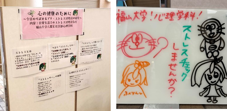 11月12日(日)に開催された健康ふくやま21フェスティバル2023で、心理学科がブースを出展しました。そこで、臨床心理学研究室の学生がストレス対処法の紹介を行いましたので、本日はその様子をご報告いたします(本学の全出展についてのブログ記事も別途掲載されます)。