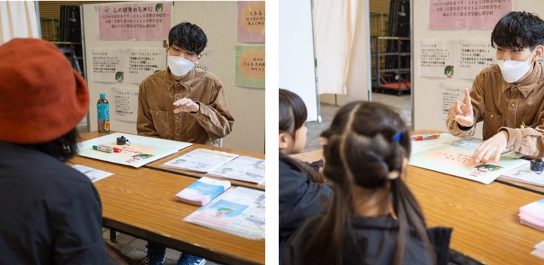 ストレス解消法には様々な種類があり、授業でもたくさん習います。しかし、実際に初めて会った人に対して対処法を紹介する機会は、学生にとっては貴重なものです。心理学というと、悩んで困っている人を対象としているイメージがあるかもしれませんが、その前の予防も重要な役割のひとつです。授業で習った知識をそこにとどめるのではなく、それを活用する機会をいただいて、学生にもとても良い経験になりました。