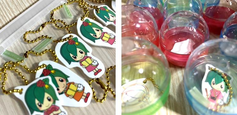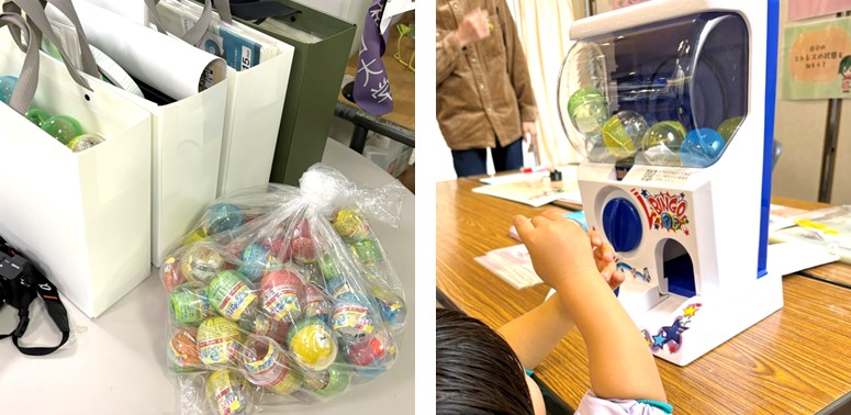 呼吸法に挑戦してくださった方には、カプセルトイのプレゼントを用意しました。中身は、柏原助手と私(濱本)が手作り(!)した、福山大学の公式キャラクターふくりんのキーホルダーでした。小さな子どもはもちろんですが、大人の方々にもとても喜んでいただけました。50人分のプレゼントを用意していましたが、それを大幅に上回る100人以上の方が参加してくださいました。