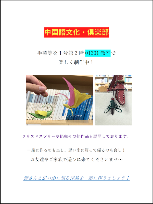 今回の中国文化に関連する展示と手芸の制作は、中国語文化倶楽部において初めての試みとなりましたが、訪れたたくさんの方々に喜んで頂くことができ、クラブ活動の充実につながった思い出に残る出来事になりました。