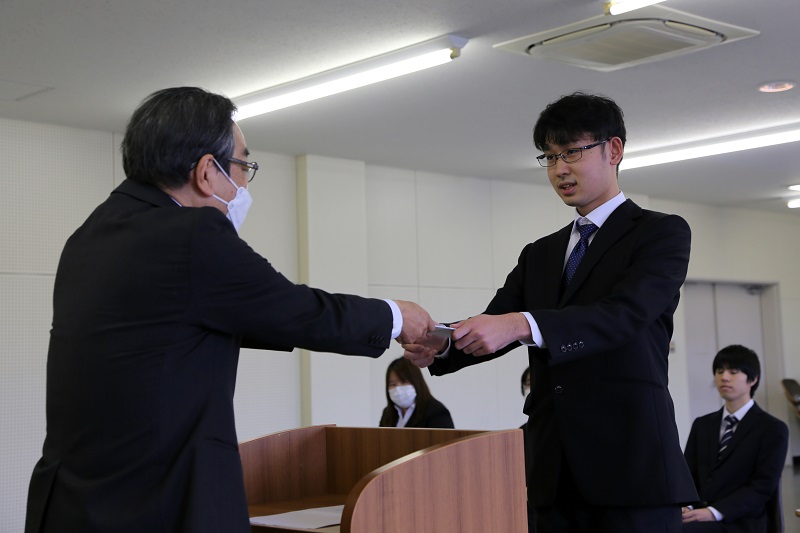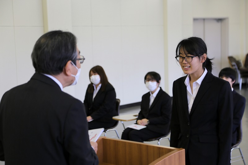 大塚学長から一人ずつ奨学金が手渡されました。応援してくれる人がいるというのは心強いものです。ぜひ、有効に活用して、自分の成長につなげてほしいですね。