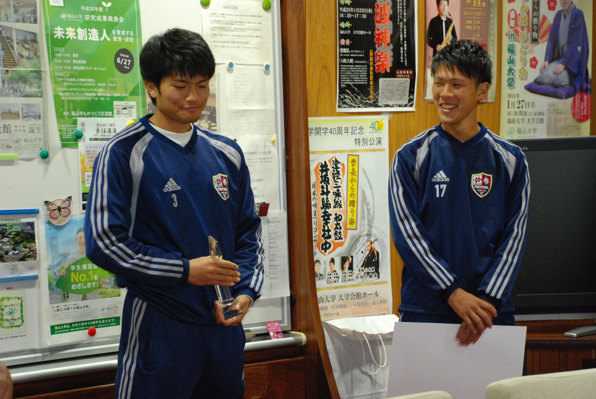 第2回(2018年度)中国大学サッカー連盟新人戦において優勝しましたので、新人戦チーム主将の泉 勇也選手(2年生・立正大学淞南高等学校(島根県)出身)と主将の畑 裕喜選手(4年生・東海大学付属静岡翔洋高等学校(静岡県)出身)の2名が、松田学長に報告しました。