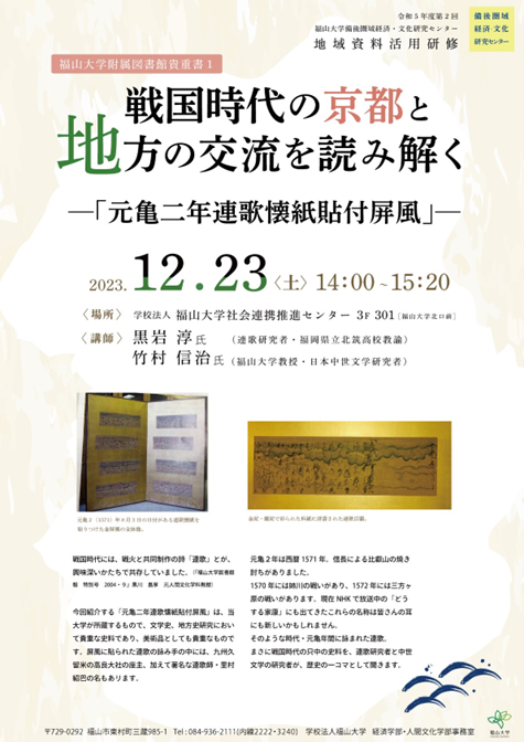 【備後圏域経済・文化研究センター】本学所蔵「元亀2年連歌懐紙貼付屏風」成立背景と新発見・大友宗麟書状の関係に迫る