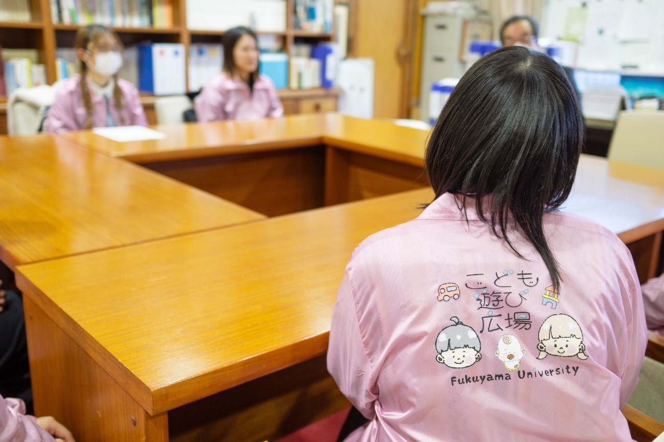 また、今年度は学内の教育振興助成金にも応募し、採択されました。この助成金で、子ども遊び広場のユニフォームも作成することができました。このユニフォームの背中に描かれているイラストは、高城琴羽さん(発達心理学研究室4年・広島県立呉三津田高等学校出身)が作成し、濱本助手と素材や色を相談しながら、業者に注文して完成しました。この優しいピンク色のユニフォームで、学生たちの士気は一層高まったようです!今回の訪問では、大塚学長に助成金のお礼も伝えました。
