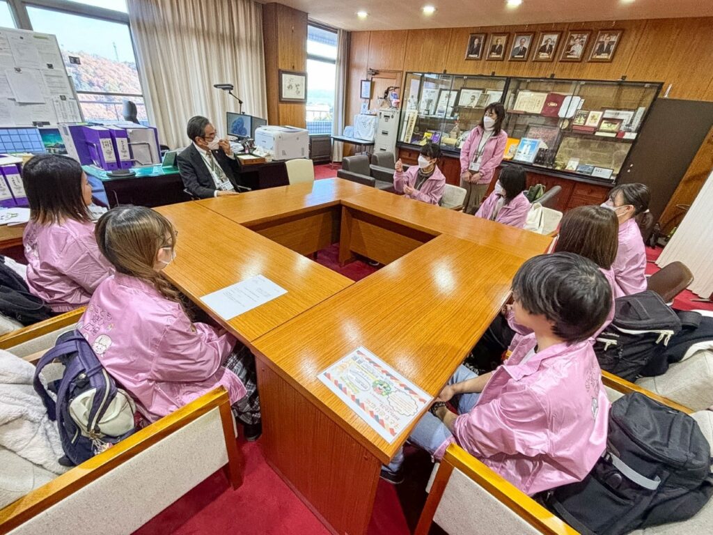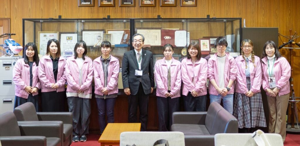 学生たちは、(公財)ひろしまこども夢財団の助成金申請書類の作成時に何度も書類を修正したことや、これまでの活動内容、今後の活動計画について、学長に報告しました。大塚学長から、書類作成に対する労いの言葉と、「書類作成は、将来社会人になった時に活かせる。」との激励の言葉を受け、学生もほっと一息。「ユニフォームの色がとても良い。」とのお褒めの言葉もいただき、メンバー同士で笑顔を見せあいました。