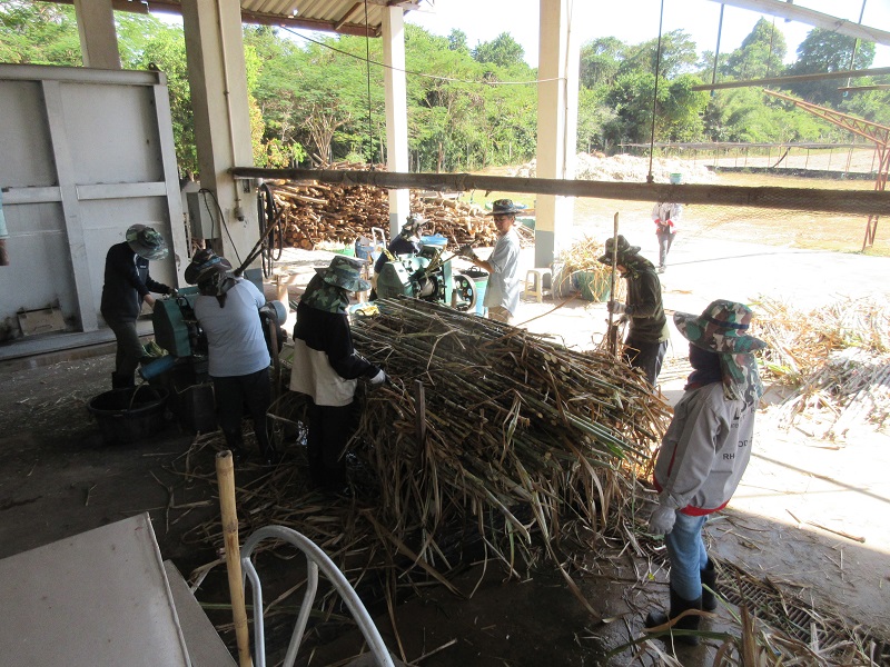 LAODI会長の井上育三さんは福山市のご出身で、社長のシハッタ・ラスフォン氏は8年間日本に留学していたこともあり、そうしたつながりの中で、本学科に特別なご配慮をいただいて研修が実現しています。今回も大変お世話になりましたことに感謝いたします。学生には、この貴重な機会を有効に利用して、しっかりとラム酒づくりについて学んでもらっています。座学だけではなく、サトウキビを刈り取るという実体験をもって、頭と体でラム酒を理解します。下の写真は、井上会長とラスフォン社長の挨拶とオリエンテーションの様子です(12月3日)。