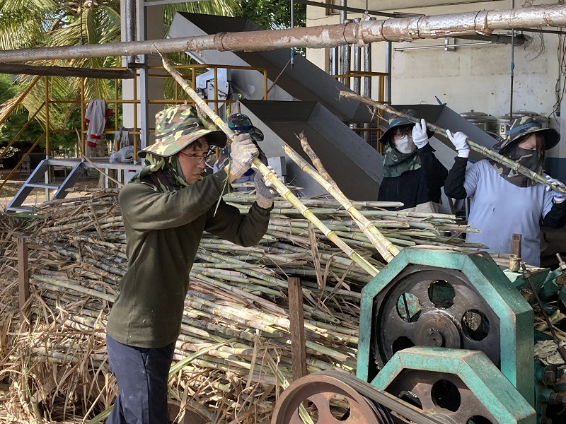 次の日の朝になりました(12月4日)。この日はサトウキビの刈り取りと搾汁を実施しました。それぞれ、1-2時間ずつの作業です。朝から30℃にはなろうかという暑さでした。昨年よりも暑かったように感じます。給水しながら、休憩を取りながら、サトウキビのほんのりとした甘みを感じながら、そしてLAODI従業員とボディランゲージでコミュニケーションをとりながら作業を進めました。LAODIの従業員は、わたしたちよりも1時間以上も早くからサトウキビを刈り始めていましたが、作業時間の少ないわたしたちは1-2時間でもうくたくたになるまで体力を消耗しました。あの美味しいラム酒が出来上がるのに、これだけの汗が流れているのかと思うと、ラム酒を飲むときには味とともにプラスアルファの何かを感じざるを得ません。