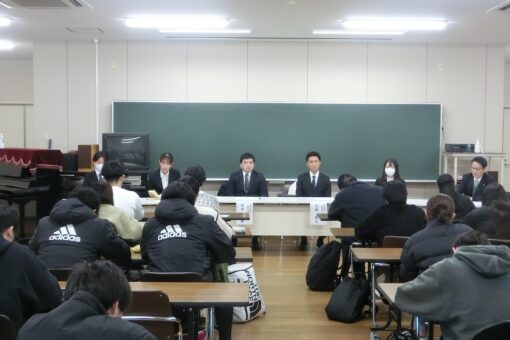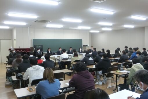司会は、教職課程委員の今井航が務めました。パネラーとして登壇したのは、人間文化学科の山本菜摘さん、経済学科の名嶋晃大くん、生物工学科の田中智教くん、海洋生物科学科の白石海宮さんと玉井優希くんの5名でした。卒業前の忙しい中、後輩たちのためになる具体的な話をするために、時間を割いてもらいました。ほんとうに、ありがとうございました。