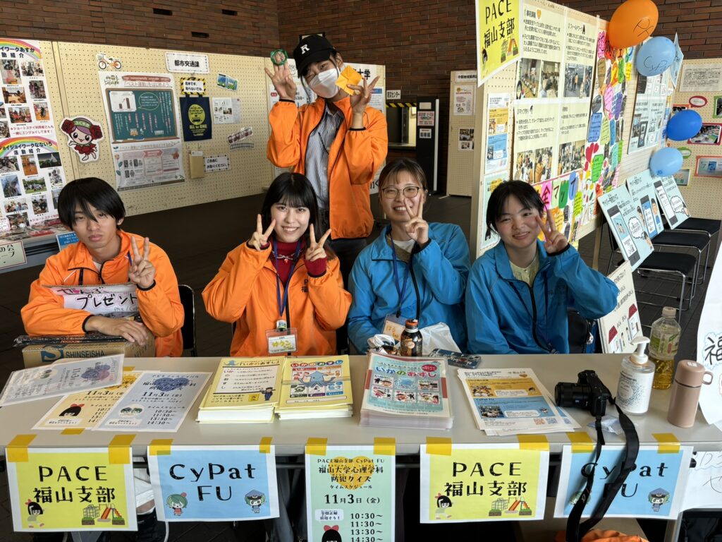 ふくやま子どもフェスティバルへの参加は、今年度が初めてでした。しかし、福山ばら祭りでの出店経験がある学生も多かったため、展示物の準備などもとてもスムーズに進めることができました。準備段階から、まちづくり推進部 若者・くらしの悩み相談課の方々に何度も相談をさせていただき、たくさんサポートしてくださいました。今後も、様々な活動を通して、私たちPACE福山支部、CyPat FUのことを地域に広めていきたいです。そして、誰もが安心して暮らせる街づくりに貢献していることを、学生の皆さんにも実感してもらいたいと思います。