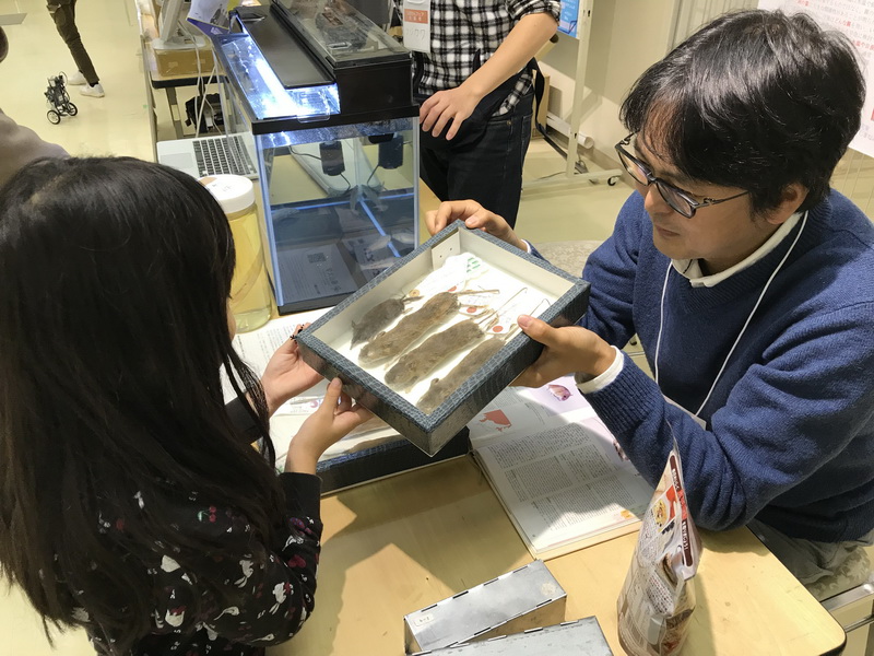福山大学のコーナーに入ってすぐ右では、佐藤准教授がネズミの標本を見ながらネズミの食性を分析して、森林生態系の動態と森と海とのつながりについて説明しましたが、ネズミの標本を見た人は、一旦たじろいで後ずさりしていました。ところが、興味の旺盛な子供たちは積極的にネズミの標本に近づいてきて、ネズミの生態系の説明を聞いたり質問をしたりしていました。